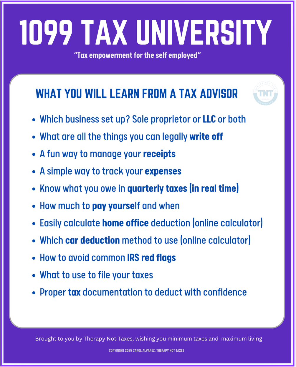 1099 Tax University was created to help self-employed therapist get tax savvy and save on taxes
